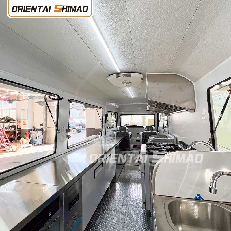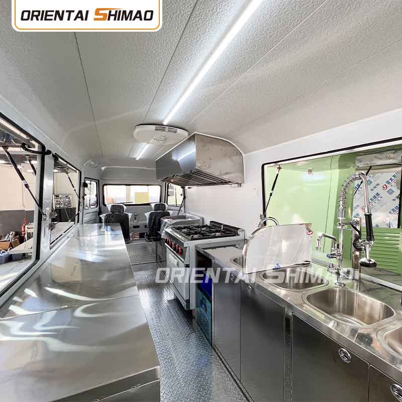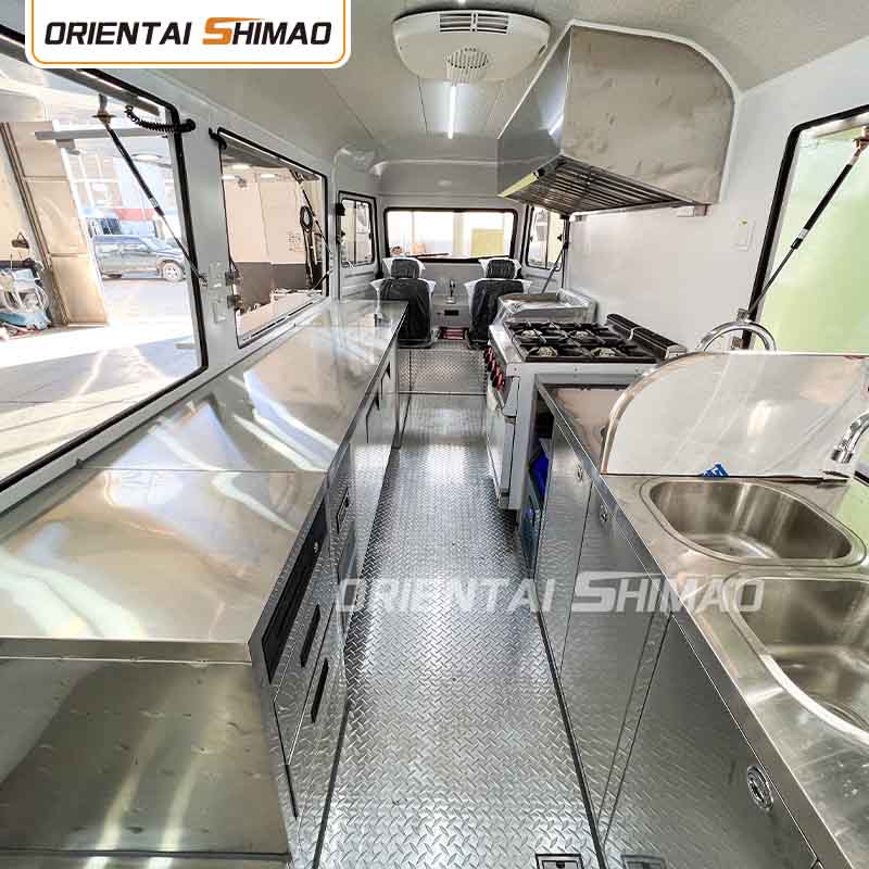 ภายในทำจากสแตนเลส: ภายในทำจากสแตนเลส ทำให้ภายในแข็งแรงและทนทาน ทำความสะอาดและบำรุงรักษาได้ง่าย และตรงตามมาตรฐานสุขอนามัยอาหาร การใช้สแตนเลสไม่เพียงแต่ช่วยยืดอายุการใช้งานของรถขายอาหารเท่านั้น แต่ยังรับประกันสุขอนามัยและความปลอดภัยของกระบวนการเตรียมอาหารอีกด้วย