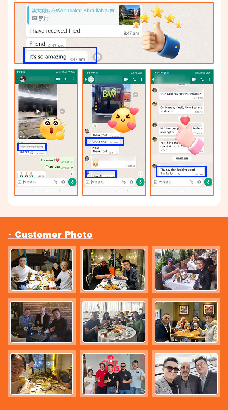 สแตนเลสสตีลสีทอง: ภายนอกของรถบรรทุกอาหารทำจากสแตนเลสสีทองคุณภาพสูง วัสดุนี้ไม่เพียงแต่มีความทนทานต่อการกัดกร่อนและการเสียดสีได้ดีเยี่ยม แต่ยังมีลักษณะสีทองช่วยเพิ่มความสวยงามของภาพและความรู้สึกคุณภาพสูง เพื่อให้รถขายอาหารโดดเด่นในสภาพแวดล้อมต่างๆ